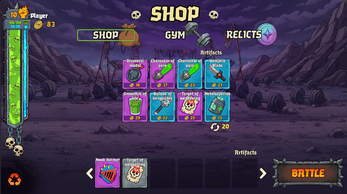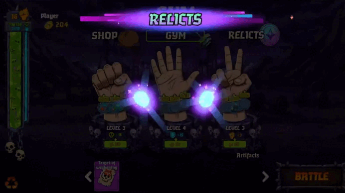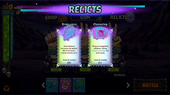 Between matches, you're given the choice of a Relic. You select the one you like and you keep it permanently. It can be activated during combat with Battle Currency you earned during that encounter. Use them and turn the battle in your favor.